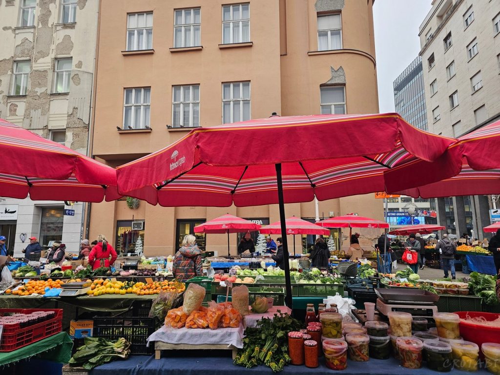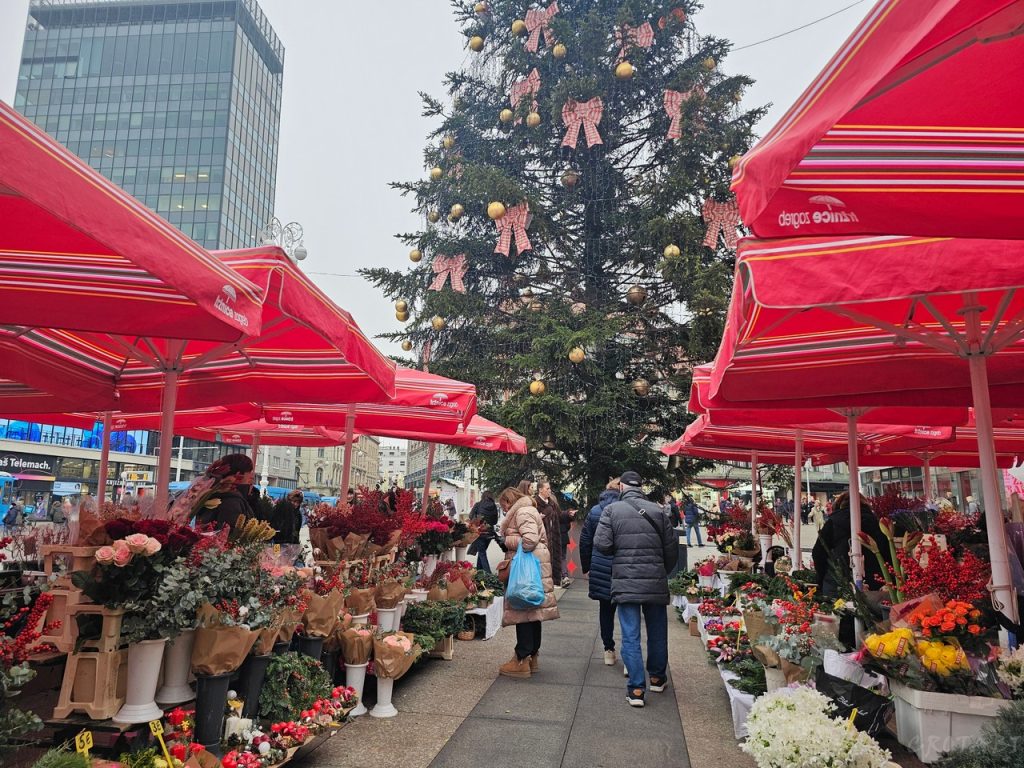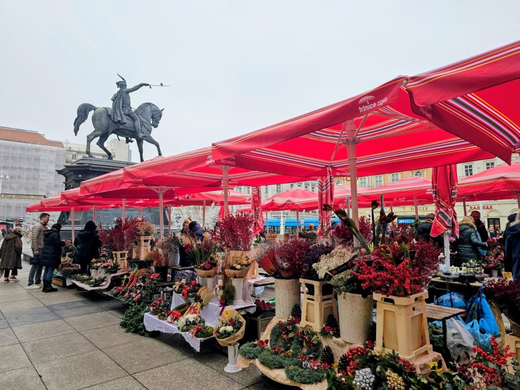 市場のお花やさんスペースがイェラチッチ総督広場に移転しているため、総督の銅像のすぐ近くに赤いパラソルが立ち並ぶという珍しい美しい景色が広がっています。(※市場、お花屋さんは8時~14時頃まで)