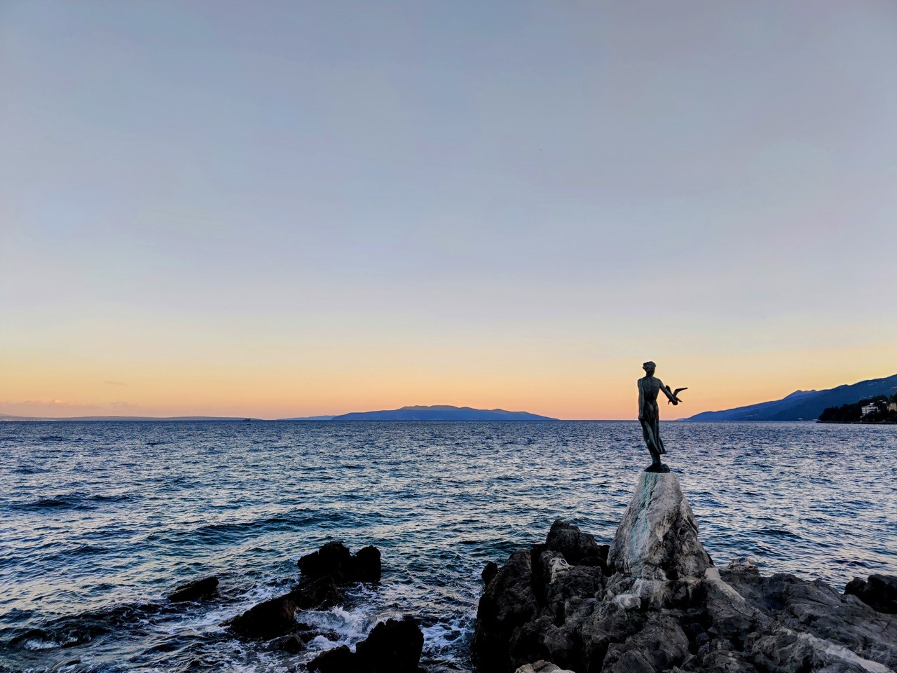 町のシンボルとも呼べる有名な彫刻「かもめと少女」。20世紀に活躍したクロアチアの彫刻家ズボンコ・カル(Zvonko Car)によって手掛けられた作品です。岩の上に立ち、アドリア海の向こう側を見つめ続ける少女……。