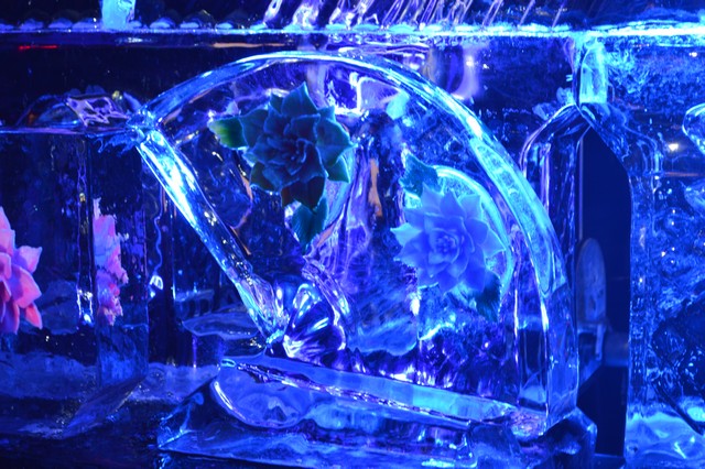 写真ではわかりにくいと思いますが、大きな透明の氷の中をドリルで削って、お花の形を作り上げてゆく見事なアート。